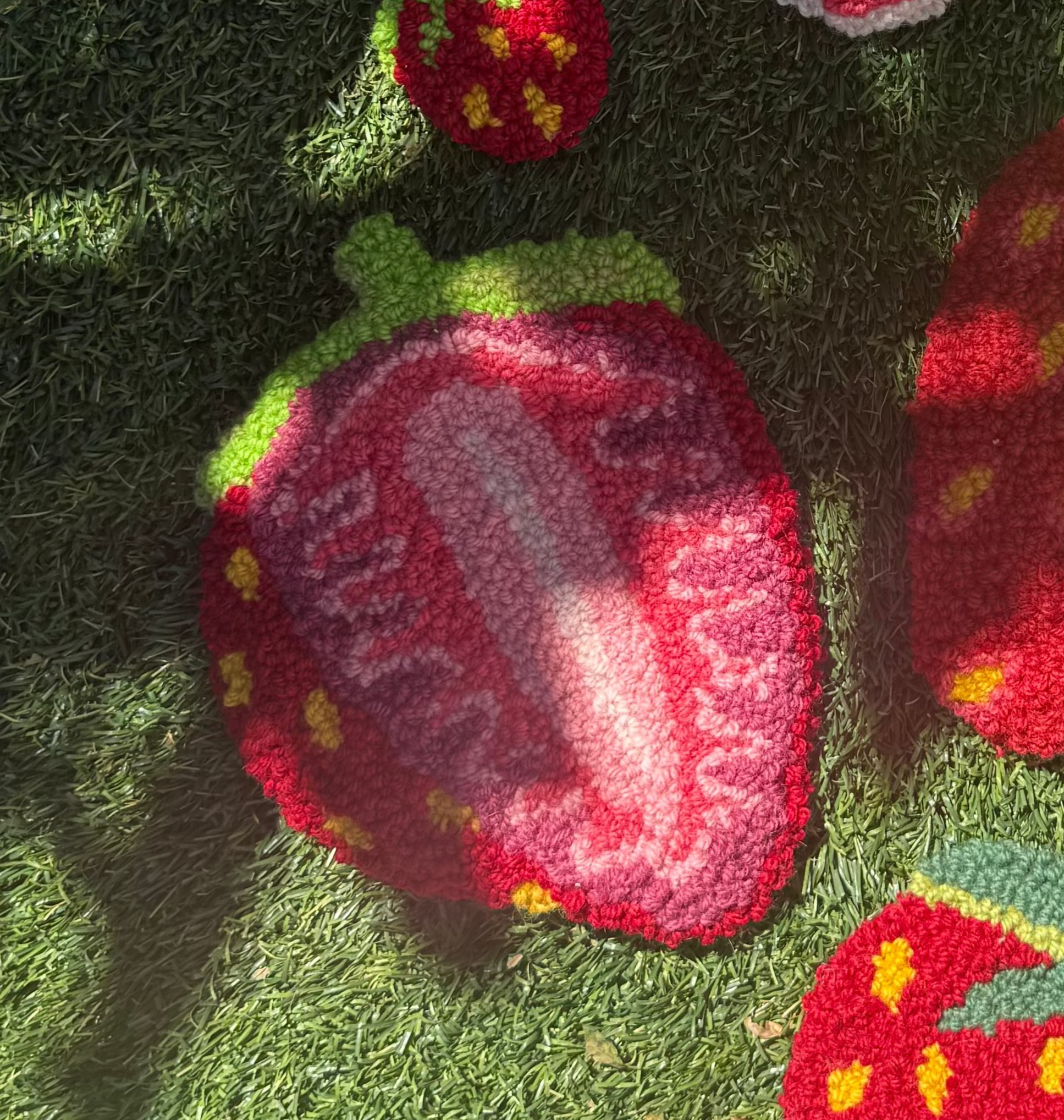 Lifecycle of a Strawberry: Phase 5 (revealed). Made of wool. Made of wool. All Lifecycle of a Strawberry pieces are hand-punched and include a hanging loop in the back. Pieces are either a foot or less in height and width.